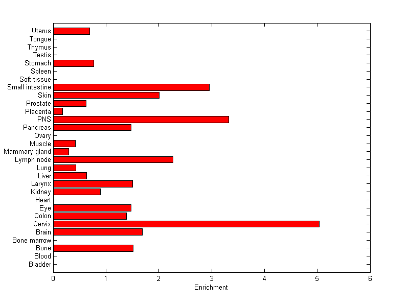 The expression level is normalized with tissue-library size. Each value for a gene in a tissue is a ratio of observed ESTs to the expected one in this tissue. The expected number of ESTs is the product of total ESTs of the gene and the fraction of total ESTs in the tissue among all ESTs in 30 tissues.
