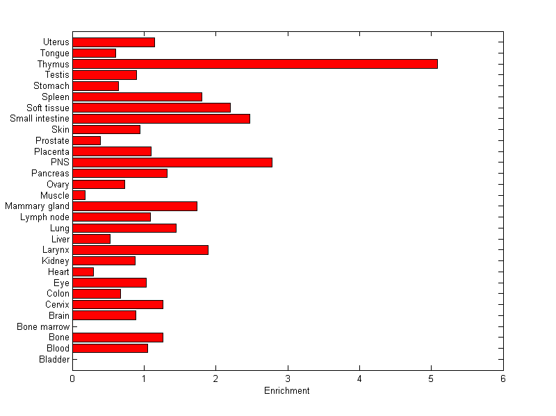 The expression level is normalized with tissue-library size. Each value for a gene in a tissue is a ratio of observed ESTs to the expected one in this tissue. The expected number of ESTs is the product of total ESTs of the gene and the fraction of total ESTs in the tissue among all ESTs in 30 tissues.