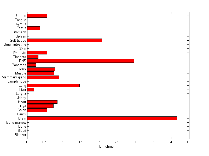 The expression level is normalized with tissue-library size. Each value for a gene in a tissue is a ratio of observed ESTs to the expected one in this tissue. The expected number of ESTs is the product of total ESTs of the gene and the fraction of total ESTs in the tissue among all ESTs in 30 tissues.