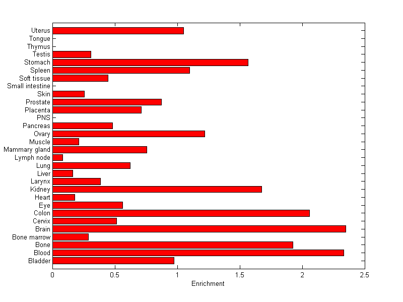 The expression level is normalized with tissue-library size. Each value for a gene in a tissue is a ratio of observed ESTs to the expected one in this tissue. The expected number of ESTs is the product of total ESTs of the gene and the fraction of total ESTs in the tissue among all ESTs in 30 tissues.