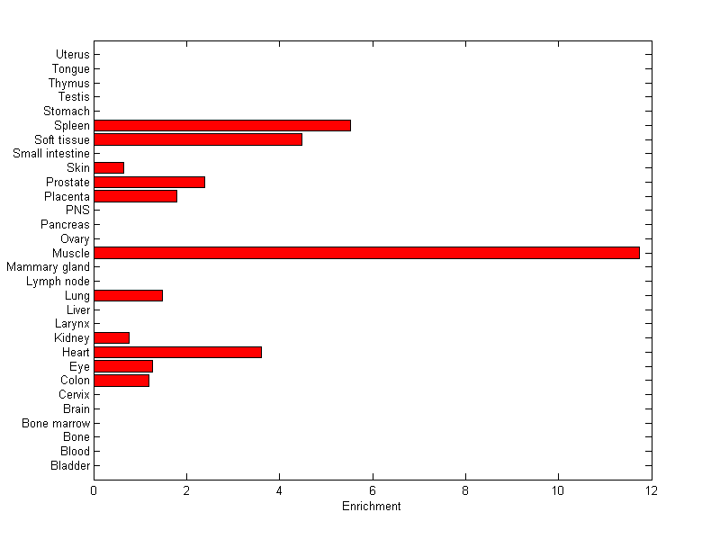 The expression level is normalized with tissue-library size. Each value for a gene in a tissue is a ratio of observed ESTs to the expected one in this tissue. The expected number of ESTs is the product of total ESTs of the gene and the fraction of total ESTs in the tissue among all ESTs in 30 tissues.