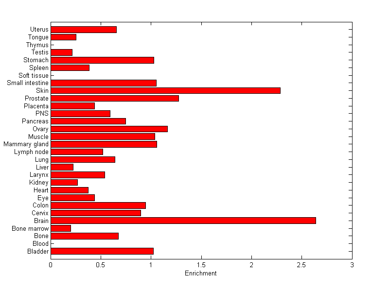 The expression level is normalized with tissue-library size. Each value for a gene in a tissue is a ratio of observed ESTs to the expected one in this tissue. The expected number of ESTs is the product of total ESTs of the gene and the fraction of total ESTs in the tissue among all ESTs in 30 tissues.