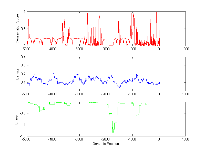 The energy profile (green curve) is about energy for module detection based on TF interaction. The positions with energy less than -1 indicate the existence of CRMs.