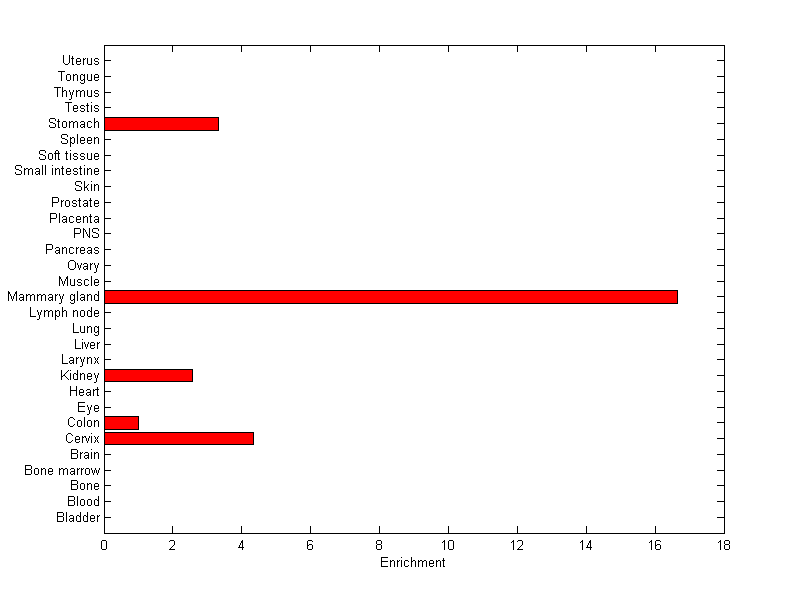 The expression level is normalized with tissue-library size. Each value for a gene in a tissue is a ratio of observed ESTs to the expected one in this tissue. The expected number of ESTs is the product of total ESTs of the gene and the fraction of total ESTs in the tissue among all ESTs in 30 tissues.