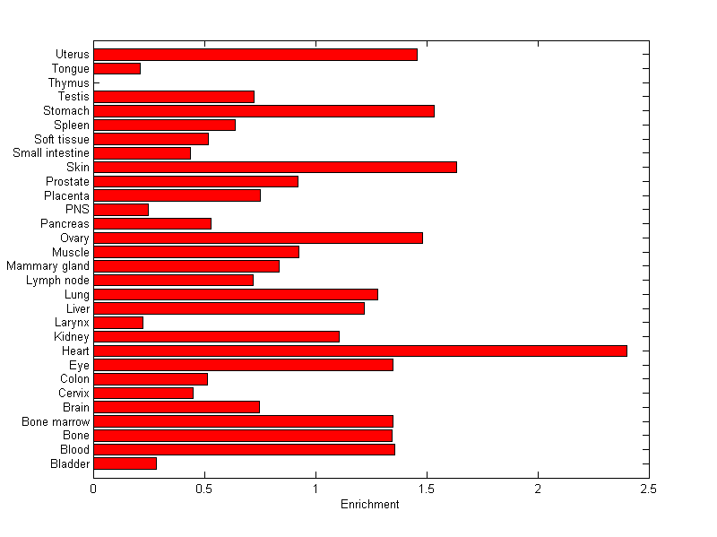 The expression level is normalized with tissue-library size. Each value for a gene in a tissue is a ratio of observed ESTs to the expected one in this tissue. The expected number of ESTs is the product of total ESTs of the gene and the fraction of total ESTs in the tissue among all ESTs in 30 tissues.