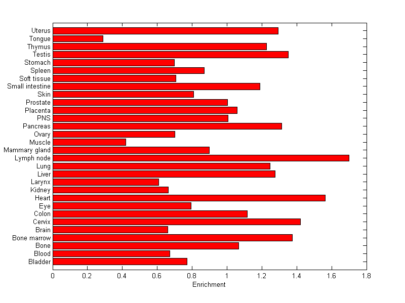 The expression level is normalized with tissue-library size. Each value for a gene in a tissue is a ratio of observed ESTs to the expected one in this tissue. The expected number of ESTs is the product of total ESTs of the gene and the fraction of total ESTs in the tissue among all ESTs in 30 tissues.
