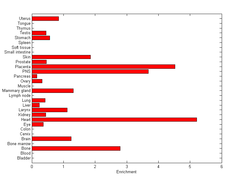 The expression level is normalized with tissue-library size. Each value for a gene in a tissue is a ratio of observed ESTs to the expected one in this tissue. The expected number of ESTs is the product of total ESTs of the gene and the fraction of total ESTs in the tissue among all ESTs in 30 tissues.