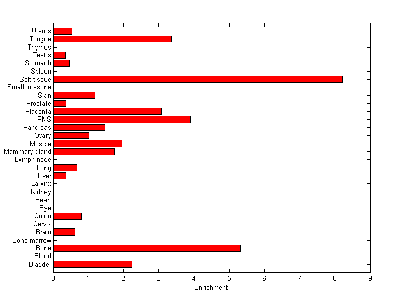 The expression level is normalized with tissue-library size. Each value for a gene in a tissue is a ratio of observed ESTs to the expected one in this tissue. The expected number of ESTs is the product of total ESTs of the gene and the fraction of total ESTs in the tissue among all ESTs in 30 tissues.