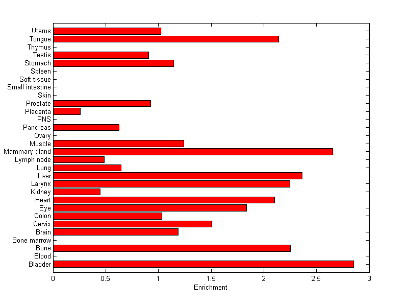 The expression level is normalized with tissue-library size. Each value for a gene in a tissue is a ratio of observed ESTs to the expected one in this tissue. The expected number of ESTs is the product of total ESTs of the gene and the fraction of total ESTs in the tissue among all ESTs in 30 tissues.