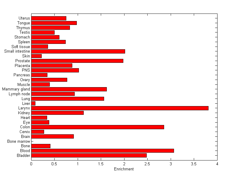 The expression level is normalized with tissue-library size. Each value for a gene in a tissue is a ratio of observed ESTs to the expected one in this tissue. The expected number of ESTs is the product of total ESTs of the gene and the fraction of total ESTs in the tissue among all ESTs in 30 tissues.