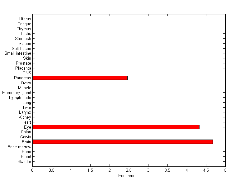 The expression level is normalized with tissue-library size. Each value for a gene in a tissue is a ratio of observed ESTs to the expected one in this tissue. The expected number of ESTs is the product of total ESTs of the gene and the fraction of total ESTs in the tissue among all ESTs in 30 tissues.