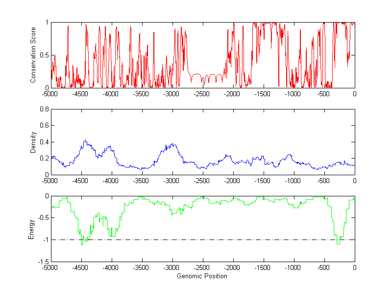 About the profiles: The conservation profile (red curve) is about conservation scores of the promoter sequences. Conservation was determined from an eight-way alignment of human, chimpanzee, dog, mouse, rat, chicken, zebrafish and fugu sequences. The conservation was quantified by a conservation score between 0 and 1, with 1 as highest conservation. The conservation score was obtained from UCSC genome databases. The density profile (blue curve) is about density of all TF binding sites. The energy profile (green curve) is about energy for module detection based on TF interaction. The positions with energy less than -1 indicate the existence of CRMs. Download: Conservation profileDensity profile Energy profile CRM summary |