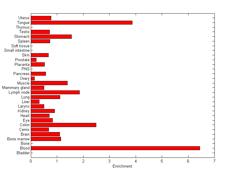 About the profile: The expression level is normalized with tissue-library size. Each value for a gene in a tissue is a ratio of observed ESTs to the expected one in this tissue. The expected number of ESTs is the product of total ESTs of the gene and the fraction of total ESTs in the tissue among all ESTs in 30 tissues. Summary: This gene is preferentially expressed in [blood] Download: |