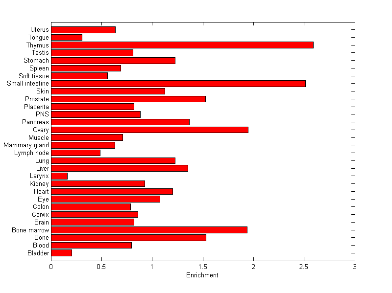 The expression level is normalized with tissue-library size. Each value for a gene in a tissue is a ratio of observed ESTs to the expected one in this tissue. The expected number of ESTs is the product of total ESTs of the gene and the fraction of total ESTs in the tissue among all ESTs in 30 tissues.
