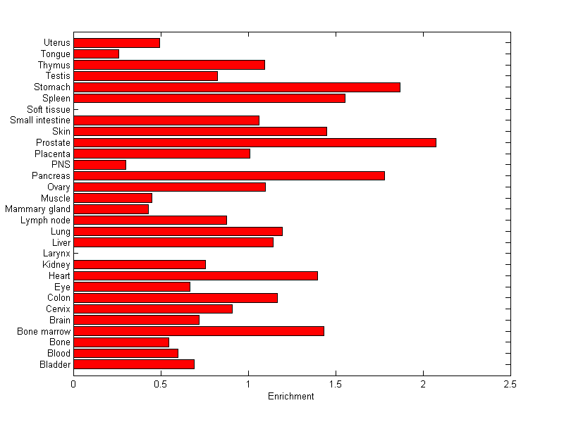 The expression level is normalized with tissue-library size. Each value for a gene in a tissue is a ratio of observed ESTs to the expected one in this tissue. The expected number of ESTs is the product of total ESTs of the gene and the fraction of total ESTs in the tissue among all ESTs in 30 tissues.