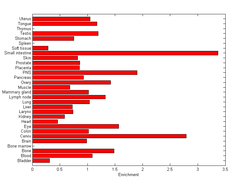 The expression level is normalized with tissue-library size. Each value for a gene in a tissue is a ratio of observed ESTs to the expected one in this tissue. The expected number of ESTs is the product of total ESTs of the gene and the fraction of total ESTs in the tissue among all ESTs in 30 tissues.
