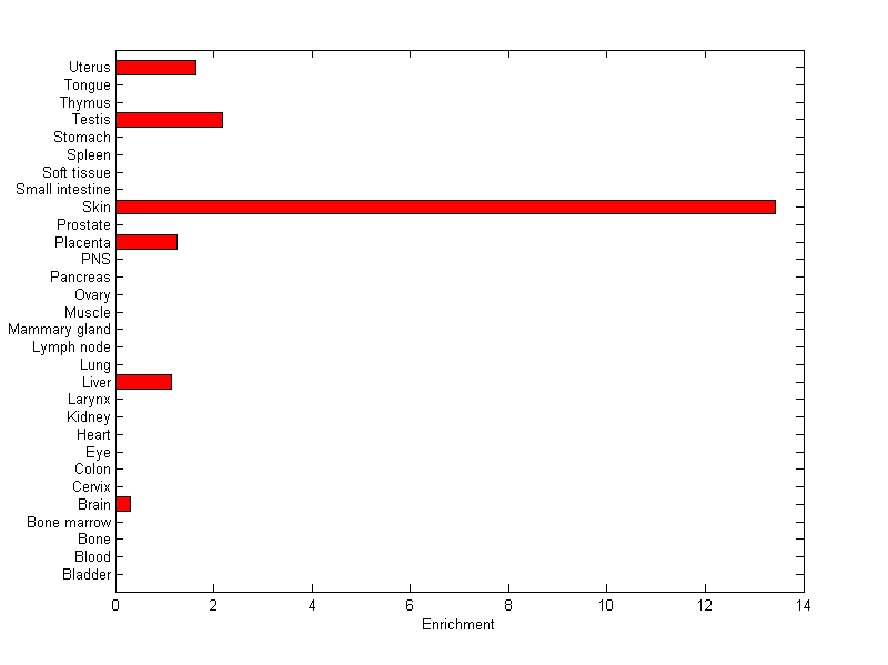 The expression level is normalized with tissue-library size. Each value for a gene in a tissue is a ratio of observed ESTs to the expected one in this tissue. The expected number of ESTs is the product of total ESTs of the gene and the fraction of total ESTs in the tissue among all ESTs in 30 tissues.