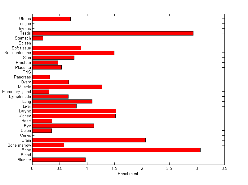 The expression level is normalized with tissue-library size. Each value for a gene in a tissue is a ratio of observed ESTs to the expected one in this tissue. The expected number of ESTs is the product of total ESTs of the gene and the fraction of total ESTs in the tissue among all ESTs in 30 tissues.