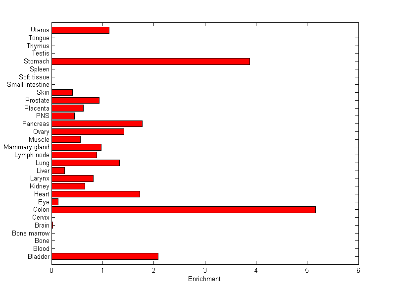 The expression level is normalized with tissue-library size. Each value for a gene in a tissue is a ratio of observed ESTs to the expected one in this tissue. The expected number of ESTs is the product of total ESTs of the gene and the fraction of total ESTs in the tissue among all ESTs in 30 tissues.