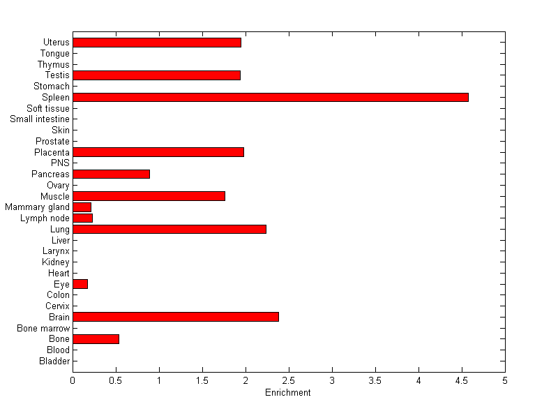 The expression level is normalized with tissue-library size. Each value for a gene in a tissue is a ratio of observed ESTs to the expected one in this tissue. The expected number of ESTs is the product of total ESTs of the gene and the fraction of total ESTs in the tissue among all ESTs in 30 tissues.