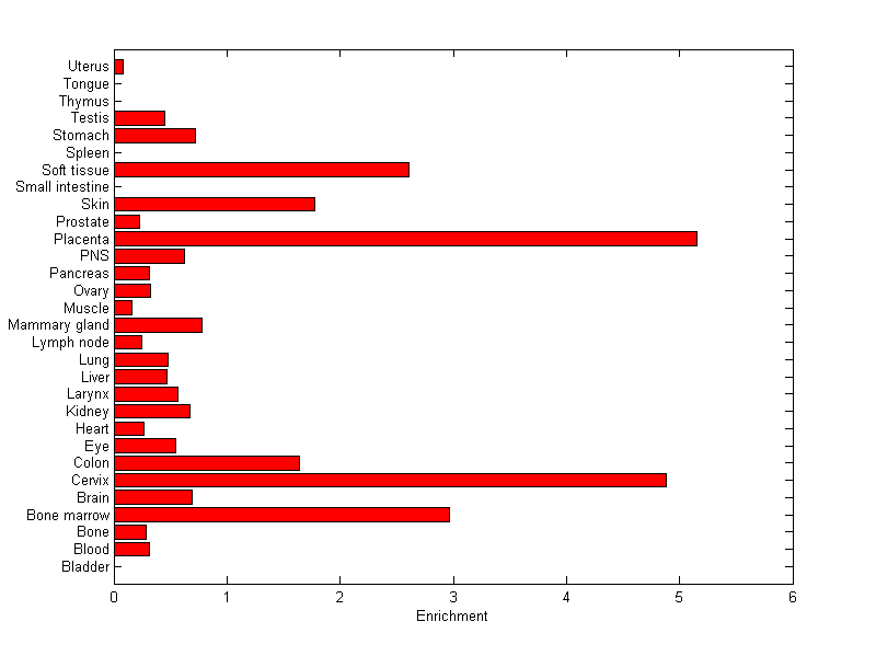 The expression level is normalized with tissue-library size. Each value for a gene in a tissue is a ratio of observed ESTs to the expected one in this tissue. The expected number of ESTs is the product of total ESTs of the gene and the fraction of total ESTs in the tissue among all ESTs in 30 tissues.