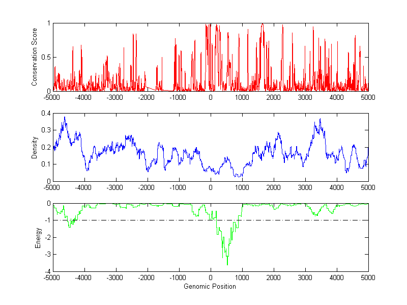 The energy profile (green curve) is about energy for module detection based on TF interaction. The positions with energy less than -1 indicate the existence of CRMs.