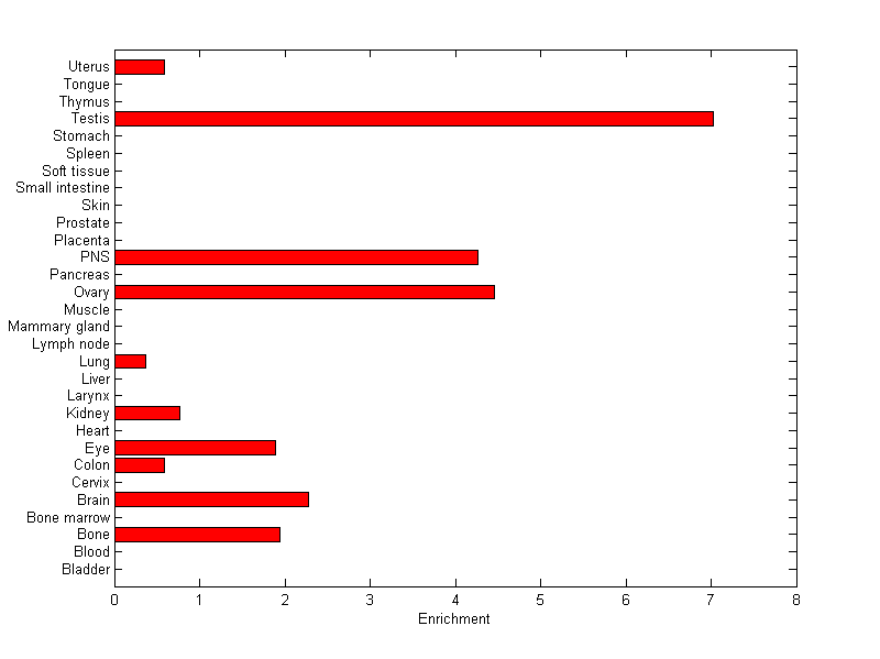 The expression level is normalized with tissue-library size. Each value for a gene in a tissue is a ratio of observed ESTs to the expected one in this tissue. The expected number of ESTs is the product of total ESTs of the gene and the fraction of total ESTs in the tissue among all ESTs in 30 tissues.