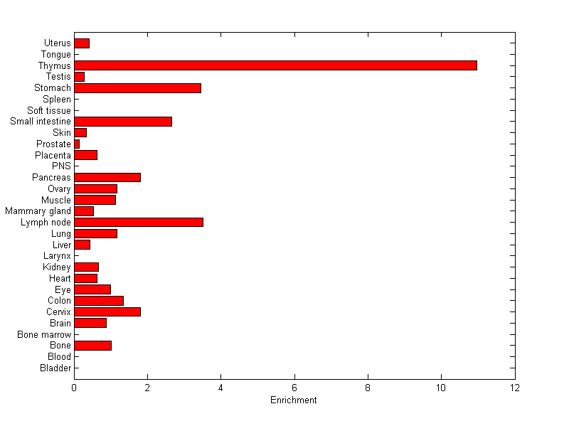The expression level is normalized with tissue-library size. Each value for a gene in a tissue is a ratio of observed ESTs to the expected one in this tissue. The expected number of ESTs is the product of total ESTs of the gene and the fraction of total ESTs in the tissue among all ESTs in 30 tissues.