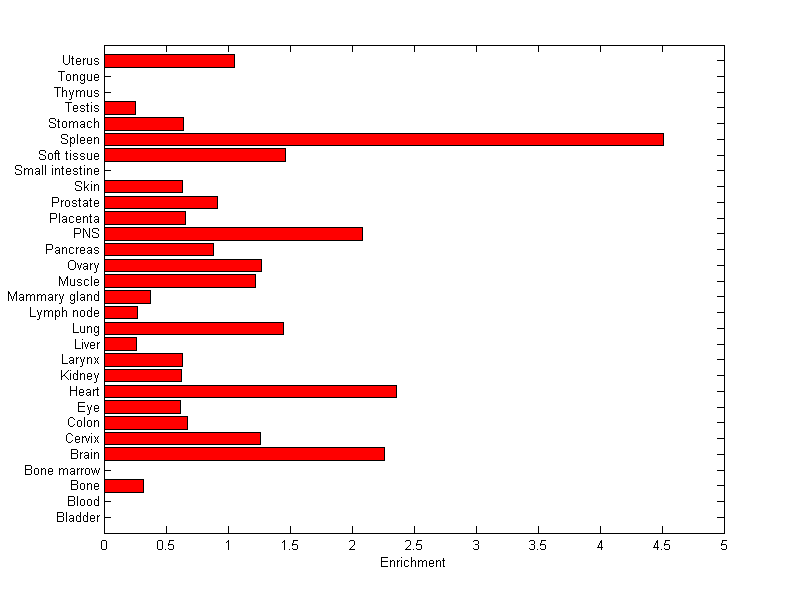 The expression level is normalized with tissue-library size. Each value for a gene in a tissue is a ratio of observed ESTs to the expected one in this tissue. The expected number of ESTs is the product of total ESTs of the gene and the fraction of total ESTs in the tissue among all ESTs in 30 tissues.