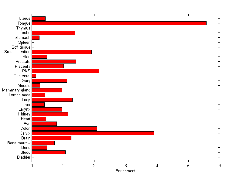 The expression level is normalized with tissue-library size. Each value for a gene in a tissue is a ratio of observed ESTs to the expected one in this tissue. The expected number of ESTs is the product of total ESTs of the gene and the fraction of total ESTs in the tissue among all ESTs in 30 tissues.