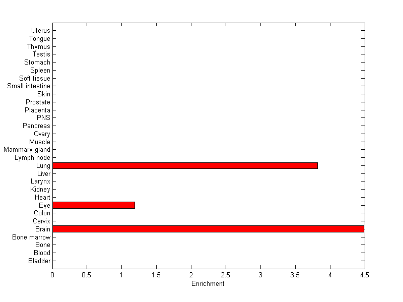The expression level is normalized with tissue-library size. Each value for a gene in a tissue is a ratio of observed ESTs to the expected one in this tissue. The expected number of ESTs is the product of total ESTs of the gene and the fraction of total ESTs in the tissue among all ESTs in 30 tissues.