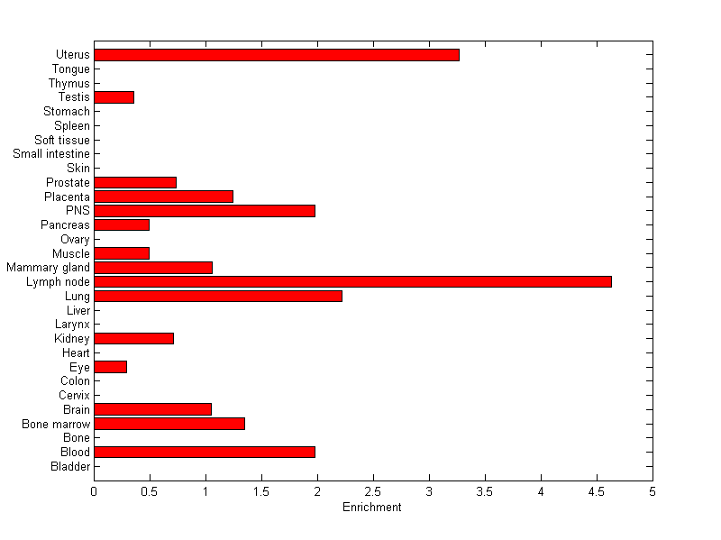 The expression level is normalized with tissue-library size. Each value for a gene in a tissue is a ratio of observed ESTs to the expected one in this tissue. The expected number of ESTs is the product of total ESTs of the gene and the fraction of total ESTs in the tissue among all ESTs in 30 tissues.