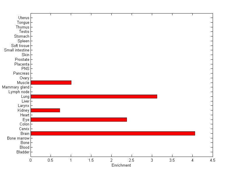 The expression level is normalized with tissue-library size. Each value for a gene in a tissue is a ratio of observed ESTs to the expected one in this tissue. The expected number of ESTs is the product of total ESTs of the gene and the fraction of total ESTs in the tissue among all ESTs in 30 tissues.