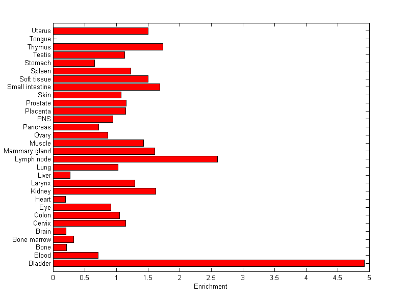 The expression level is normalized with tissue-library size. Each value for a gene in a tissue is a ratio of observed ESTs to the expected one in this tissue. The expected number of ESTs is the product of total ESTs of the gene and the fraction of total ESTs in the tissue among all ESTs in 30 tissues.