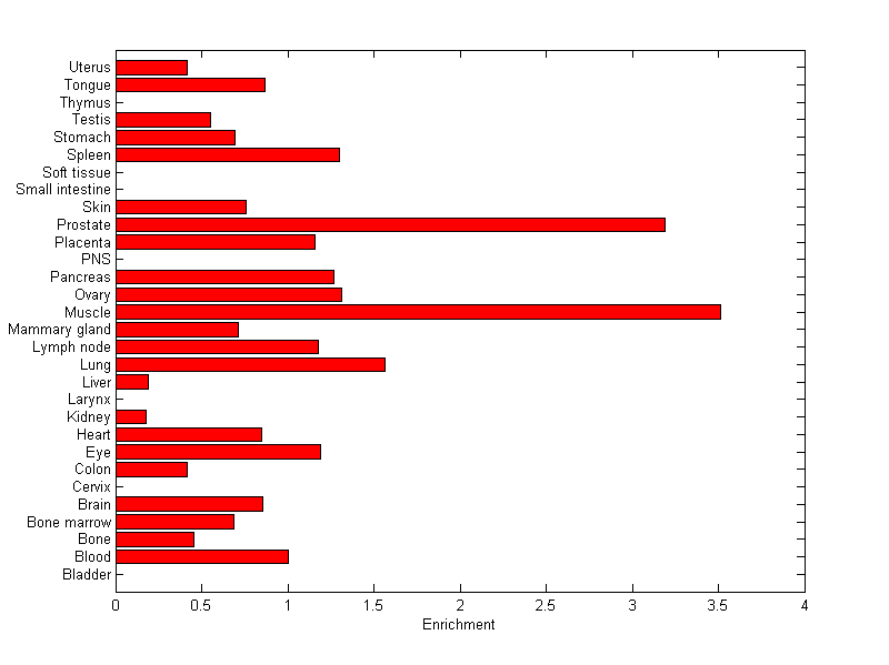 The expression level is normalized with tissue-library size. Each value for a gene in a tissue is a ratio of observed ESTs to the expected one in this tissue. The expected number of ESTs is the product of total ESTs of the gene and the fraction of total ESTs in the tissue among all ESTs in 30 tissues.