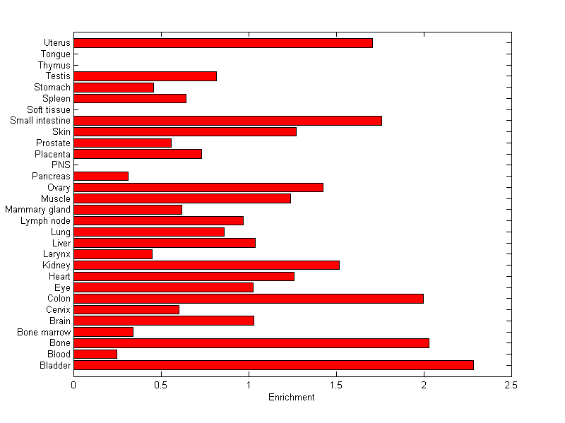 The expression level is normalized with tissue-library size. Each value for a gene in a tissue is a ratio of observed ESTs to the expected one in this tissue. The expected number of ESTs is the product of total ESTs of the gene and the fraction of total ESTs in the tissue among all ESTs in 30 tissues.