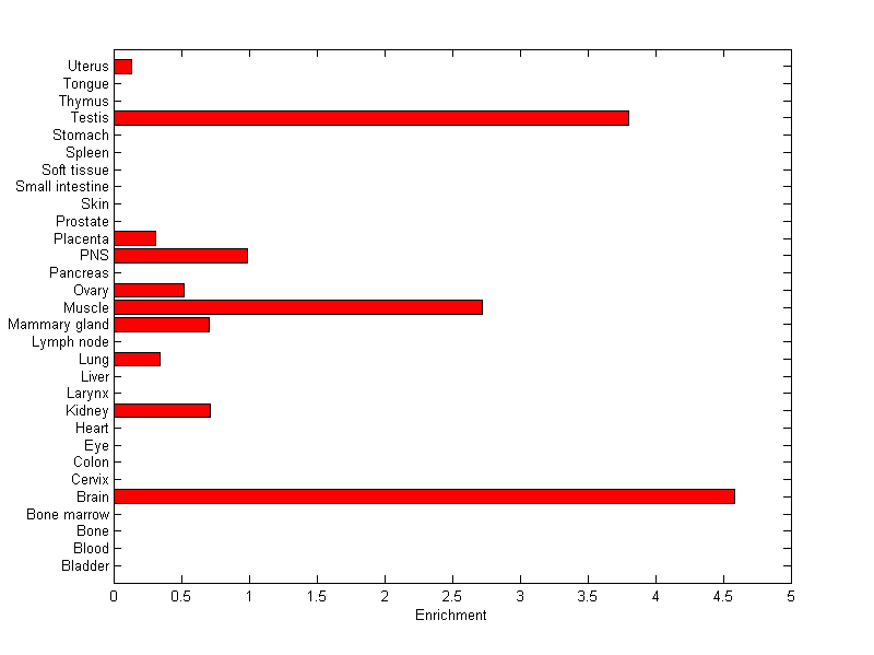 The expression level is normalized with tissue-library size. Each value for a gene in a tissue is a ratio of observed ESTs to the expected one in this tissue. The expected number of ESTs is the product of total ESTs of the gene and the fraction of total ESTs in the tissue among all ESTs in 30 tissues.