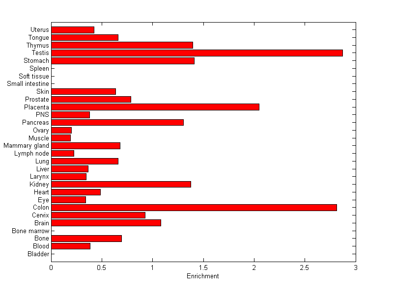 The expression level is normalized with tissue-library size. Each value for a gene in a tissue is a ratio of observed ESTs to the expected one in this tissue. The expected number of ESTs is the product of total ESTs of the gene and the fraction of total ESTs in the tissue among all ESTs in 30 tissues.