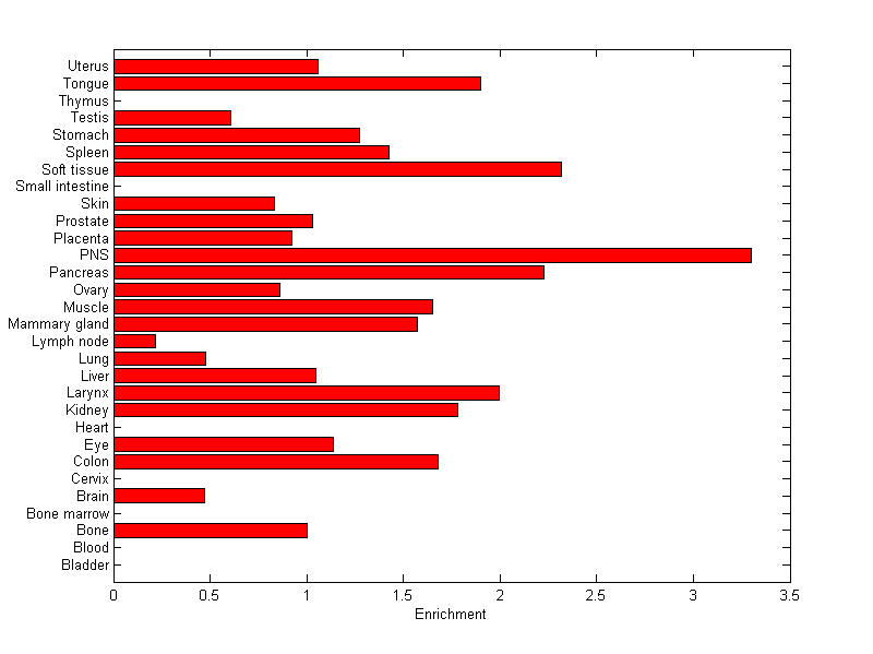 The expression level is normalized with tissue-library size. Each value for a gene in a tissue is a ratio of observed ESTs to the expected one in this tissue. The expected number of ESTs is the product of total ESTs of the gene and the fraction of total ESTs in the tissue among all ESTs in 30 tissues.