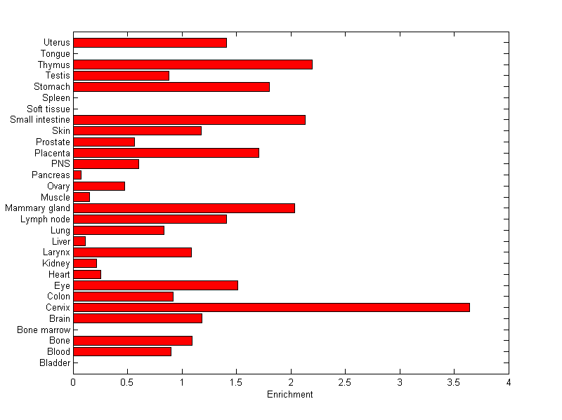 The expression level is normalized with tissue-library size. Each value for a gene in a tissue is a ratio of observed ESTs to the expected one in this tissue. The expected number of ESTs is the product of total ESTs of the gene and the fraction of total ESTs in the tissue among all ESTs in 30 tissues.