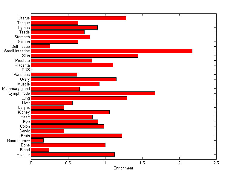 The expression level is normalized with tissue-library size. Each value for a gene in a tissue is a ratio of observed ESTs to the expected one in this tissue. The expected number of ESTs is the product of total ESTs of the gene and the fraction of total ESTs in the tissue among all ESTs in 30 tissues.