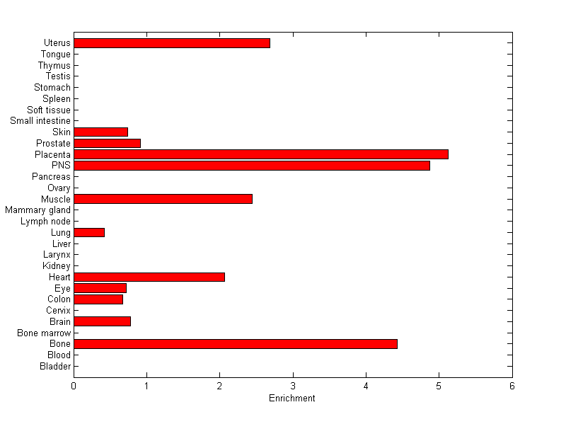 The expression level is normalized with tissue-library size. Each value for a gene in a tissue is a ratio of observed ESTs to the expected one in this tissue. The expected number of ESTs is the product of total ESTs of the gene and the fraction of total ESTs in the tissue among all ESTs in 30 tissues.
