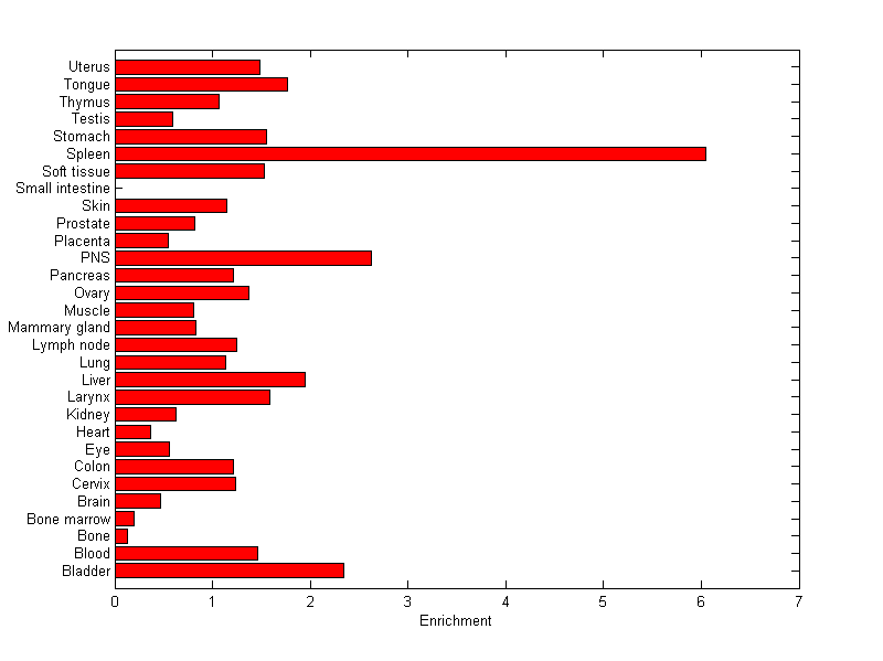 About the profile: The expression level is normalized with tissue-library size. Each value for a gene in a tissue is a ratio of observed ESTs to the expected one in this tissue. The expected number of ESTs is the product of total ESTs of the gene and the fraction of total ESTs in the tissue among all ESTs in 30 tissues. Summary: This gene is preferentially expressed in [spleen] Download: |