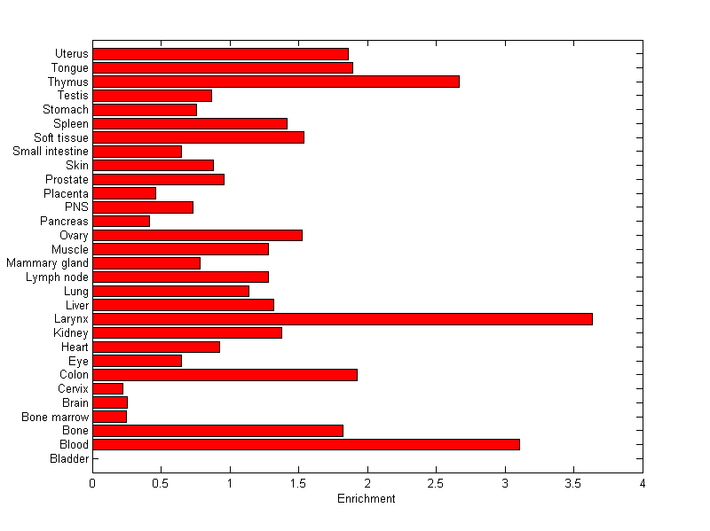 The expression level is normalized with tissue-library size. Each value for a gene in a tissue is a ratio of observed ESTs to the expected one in this tissue. The expected number of ESTs is the product of total ESTs of the gene and the fraction of total ESTs in the tissue among all ESTs in 30 tissues.