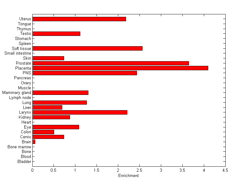 The expression level is normalized with tissue-library size. Each value for a gene in a tissue is a ratio of observed ESTs to the expected one in this tissue. The expected number of ESTs is the product of total ESTs of the gene and the fraction of total ESTs in the tissue among all ESTs in 30 tissues.