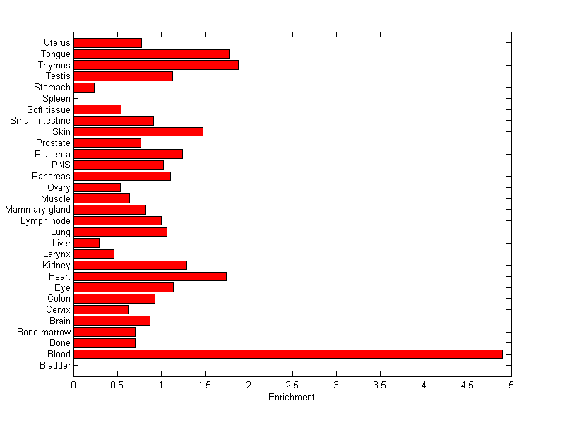 The expression level is normalized with tissue-library size. Each value for a gene in a tissue is a ratio of observed ESTs to the expected one in this tissue. The expected number of ESTs is the product of total ESTs of the gene and the fraction of total ESTs in the tissue among all ESTs in 30 tissues.