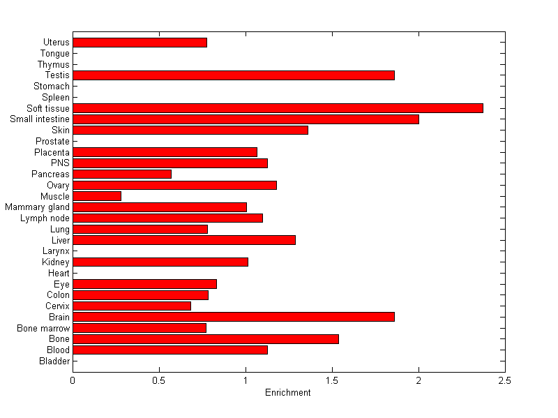 The expression level is normalized with tissue-library size. Each value for a gene in a tissue is a ratio of observed ESTs to the expected one in this tissue. The expected number of ESTs is the product of total ESTs of the gene and the fraction of total ESTs in the tissue among all ESTs in 30 tissues.