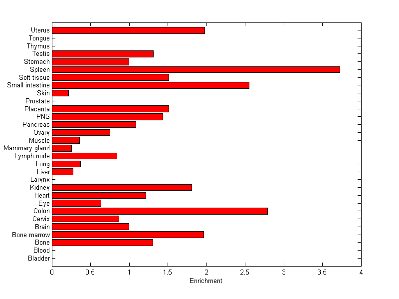 The expression level is normalized with tissue-library size. Each value for a gene in a tissue is a ratio of observed ESTs to the expected one in this tissue. The expected number of ESTs is the product of total ESTs of the gene and the fraction of total ESTs in the tissue among all ESTs in 30 tissues.