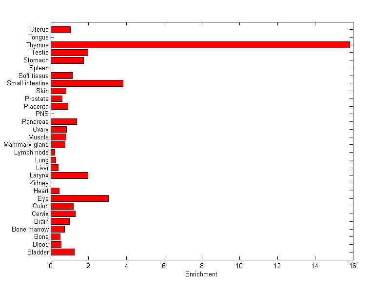 The expression level is normalized with tissue-library size. Each value for a gene in a tissue is a ratio of observed ESTs to the expected one in this tissue. The expected number of ESTs is the product of total ESTs of the gene and the fraction of total ESTs in the tissue among all ESTs in 30 tissues.