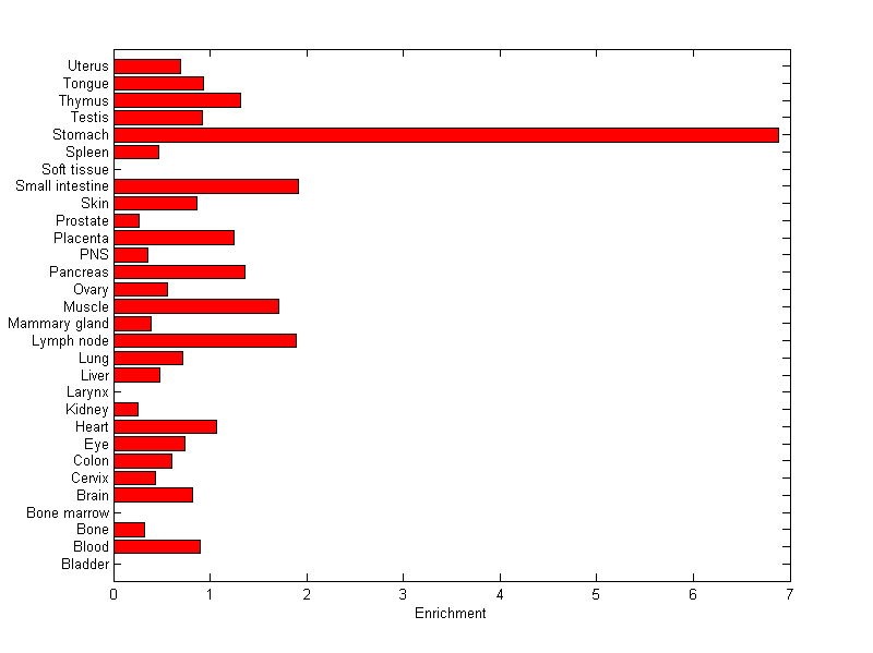 The expression level is normalized with tissue-library size. Each value for a gene in a tissue is a ratio of observed ESTs to the expected one in this tissue. The expected number of ESTs is the product of total ESTs of the gene and the fraction of total ESTs in the tissue among all ESTs in 30 tissues.